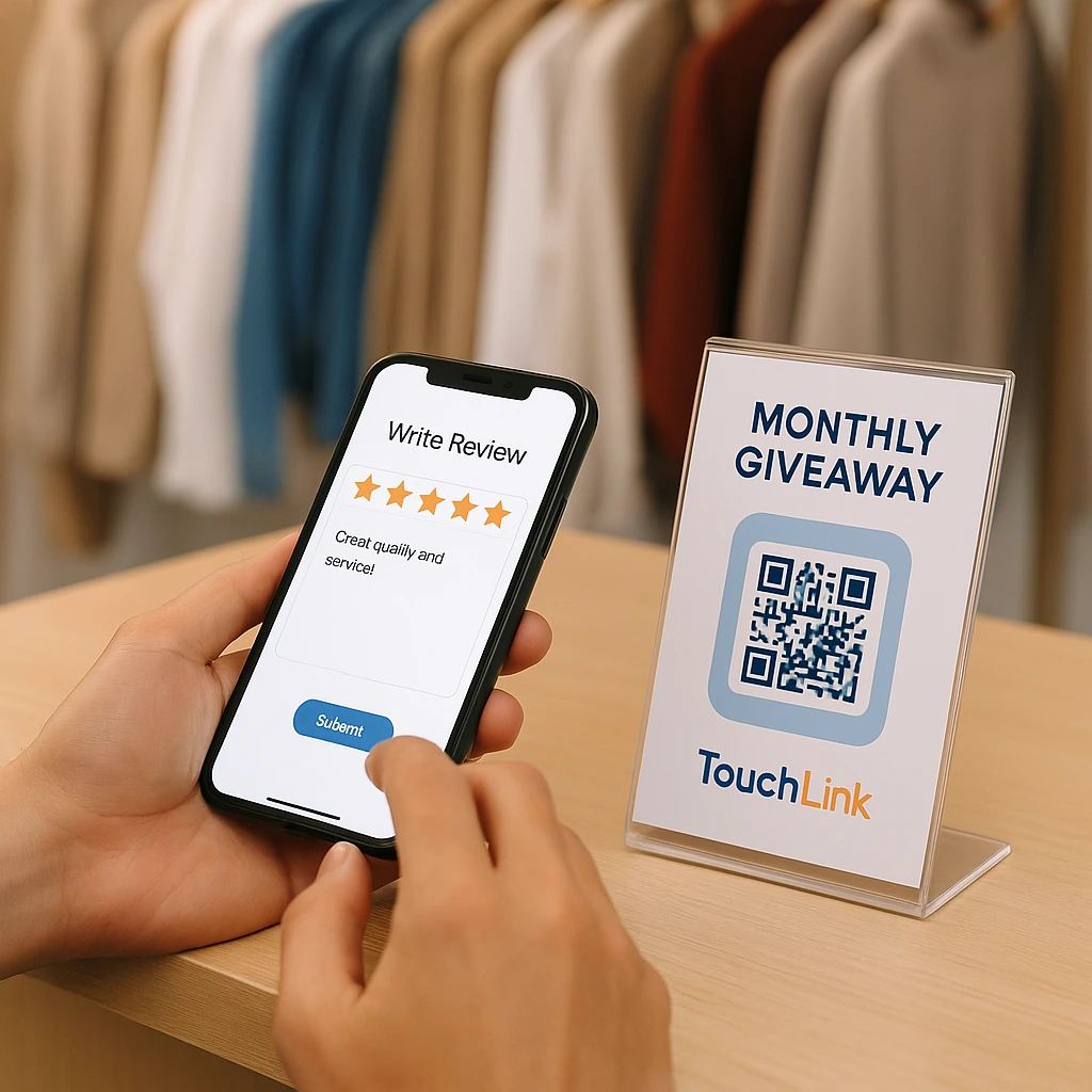 Το TouchLink βοηθά την επιχείρησή σου να μαζεύει αληθινές, θετικές αξιολογήσεις χωρίς πίεση, χωρίς προσπάθεια. Με ένα μόνο scan, ο πελάτης αφήνει τη γνώμη του και μπαίνει αυτόματα στο μηνιαίο Giveaway. Εσύ κερδίζεις φήμη, εκείνος την ευκαιρία να κερδίσει δώρα.